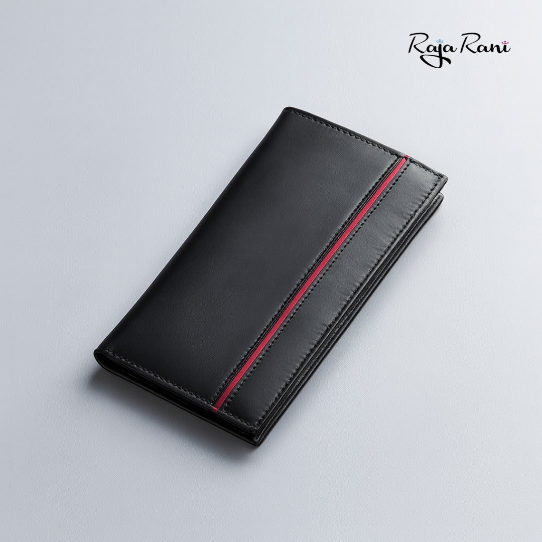 The Long Ruby is an executive-level long (Continental-sized) wallet that commands attention. Its large, flat profile is covered in smooth, luxurious matte black leather, creating a backdrop of sophistication. The striking feature is the singular, sharp ruby-red leather stripe that cuts diagonally across the front, providing a powerful, high-impact aesthetic. This elongated design offers extensive organization capabilities, easily accommodating multiple currencies, a substantial number of cards, and travel documents, all while making a distinct style statement every time it's used.