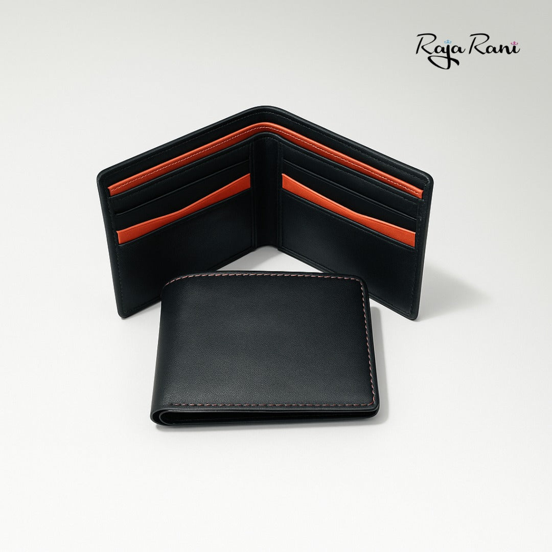 The Standard Blaze is a bold, standard-sized bifold that makes a statement with its internal color pop. The exterior is crafted from smooth, deep matte black leather, maintaining a sleek and classic look. The only external detail is a fine line of subtle pinkish-red stitching around the edge, adding a unique touch. When opened, the wallet reveals a vibrant, high-contrast interior lining in a shocking tangerine orange. This blaze of color highlights the card slots and serves as a hidden accent. Offering both a timeless black exterior and an energetic, organized interior, this wallet perfectly balances professionalism with personality
